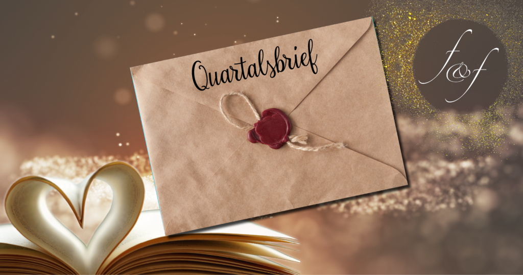 Einmal im Quartal versende ich meinen „f & f“-Quartalsbrief an meine Stammkund:innen und alle, die es noch werden wollen. Erfahre immer als Erstes, wenn es etwas Neues gibt, profitiere von Sonderangeboten und exklusivem Zusatzmaterial und stöbere durch bereits erschienene Bücher, an denen ich mitwirken durfte.