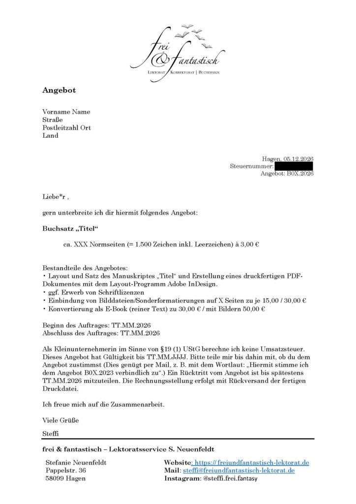 Bis zum vereinbarten Start des Auftrages hast du Zeit, mir die verbliebenen Infos, das vollständige und fertig korrigierte Manuskript (inkl. Impressum, evtl Widmungen und Anhänge) und etwaige Bilddateien zuzusenden. Gern auch bereits etwas früher, damit ich Zeit habe, sie durchzusehen.