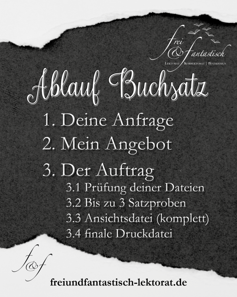Anhand meiner Probe kannst du dich für das finale Layout, die Schriften und -größen entscheiden. Erfahrungsgemäß gibt es beim ersten Entwurf noch Änderungswünsche, daher sind bis zu drei Proben im Preis inbegriffen, damit wir uns schrittweise an deine Wunschgestaltung annähern können. Da in dieser Phase mehrere Mails und Dateien zwischen uns hin und hergehen, ist es gut, wenn du dir hierfür etwas Zeit einplanst. Je schneller ich deine Rückmeldungen bekomme, desto zügiger komme ich mit deinem Projekt voran. Das bedeutet natürlich nicht, dass du dir nicht ein paar Tage Bedenkzeit nehmen kannst, um dich für oder gegen einen Entwurf zu entscheiden. Aber sollte ich hier Wochen auf eine Entscheidung warten, bleibt natürlich auch dein Manuskript so lange liegen und ich kann ggf. den vereinbarten Fertigstellungstermin nicht einhalten. Also halte dir dafür etwas Zeit frei. 🙂