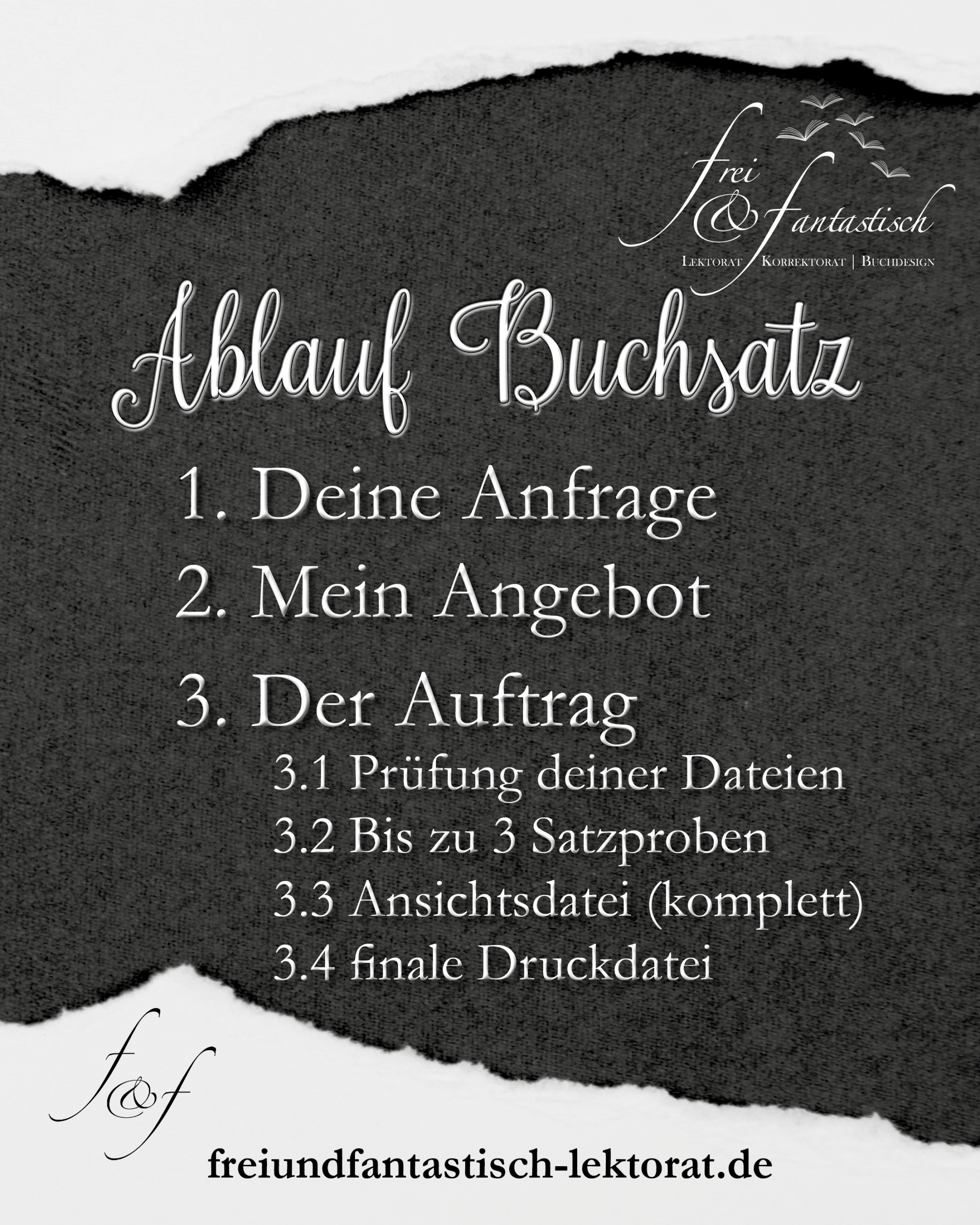 Zuallererst beginnt jede Zusammenarbeit mit deiner Anfrage. Diese kannst du einfach per Mail an steffi@freiundfantastisch-lektorat.de stellen oder du nutzt mein Anfrageformular. Deine Anfrage ist selbstverständlich unverbindlich und dient erstmal dazu, abzuklären, was du von mir möchtest, was ich für dich tun kann und ob wir mit beidem übereinkommen. Um dir darüber klar zu werden, was du eigentlich möchtest, und damit ich dein Anliegen besser einschätzen kann, habe ich einen Fragebogen (PDF zum Download) entwickelt. Darin frage ich einiges über den Umfang, die gewünschten Schriften und das Layout ab. Du musst noch nicht für alles eine Antwort parat haben, aber so gewinnst du schon mal einen Eindruck, was ich spätestens beim Zustandekommen des Auftrages wissen muss.